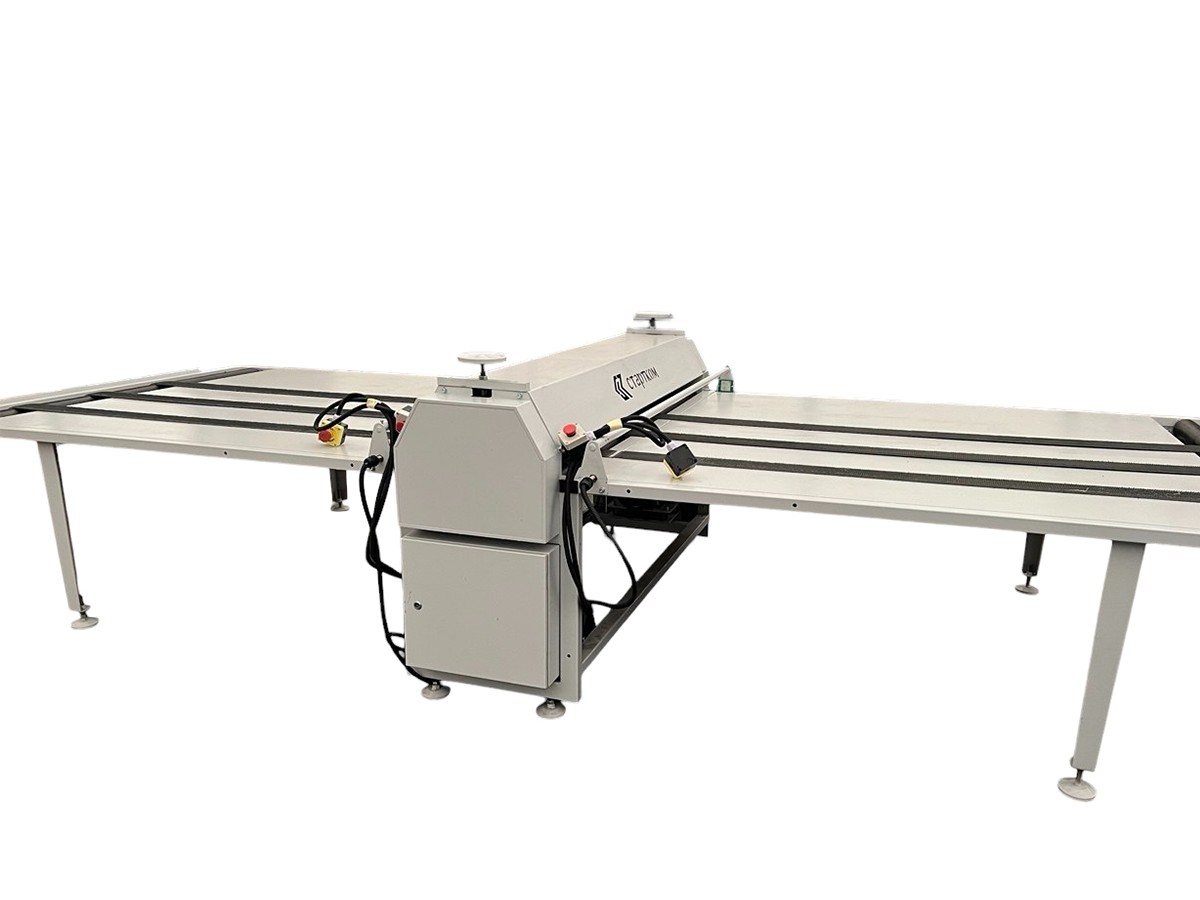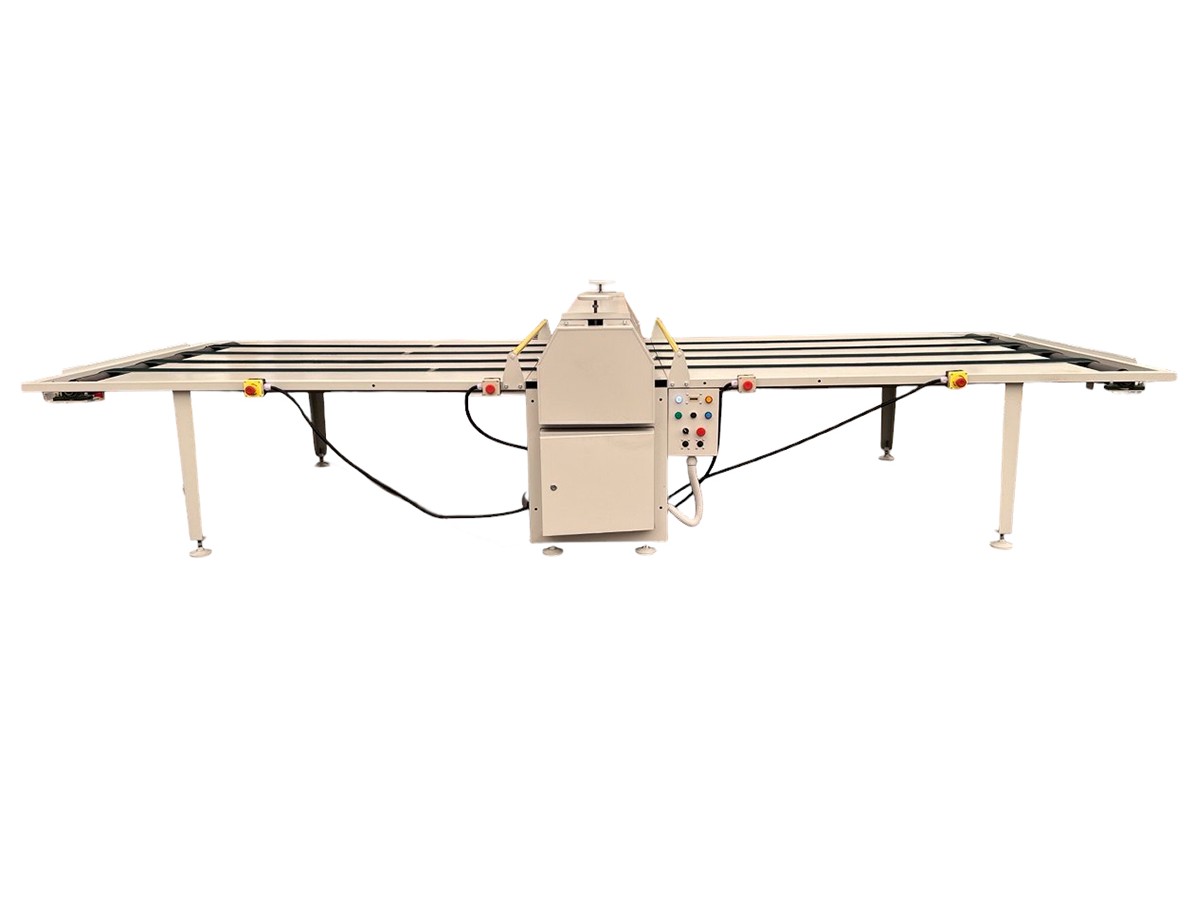 Штанцевальная форма с заготовкой перемещается с одного стола станка через валы на другой стол, где заготовка снимается и кладется новая. Кожухи станка обеспечивают безопасную работу.